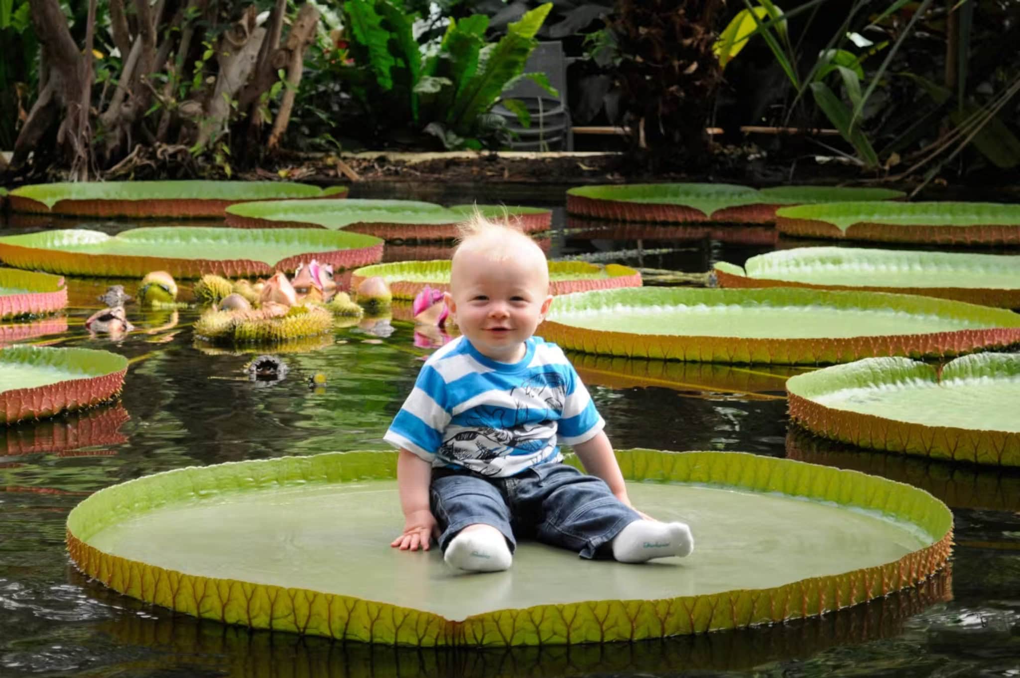 “In Nederland zijn er ongetwijfeld duizenden mensen te vinden die als kind op een van de bladeren zijn vastgelegd”, aldus Blijdorp. Nadat het ook vele jaren niet mogelijk was, biedt de dierentuin nu weer de kans om je baby te laten fotograferen – liggend op een reuzenblad van de Victoria amazonica. Dat is een gigantische waterlelie uit het Amazonegebied in Zuid-Amerika.