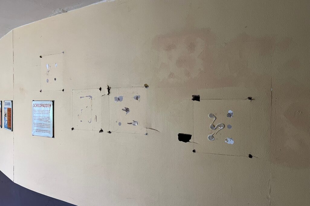De borden zelf waren al beveiligd. “Ze zitten vast met kit en schroeven, waardoor je ze eigenlijk niet loskrijgt. Maar op een of andere manier lukt het toch”, betreurt de voorlichter. Op een muur aan de achterzijde van de Rivièrahal is duidelijk te zien waar de bordjes hebben gehangen.
