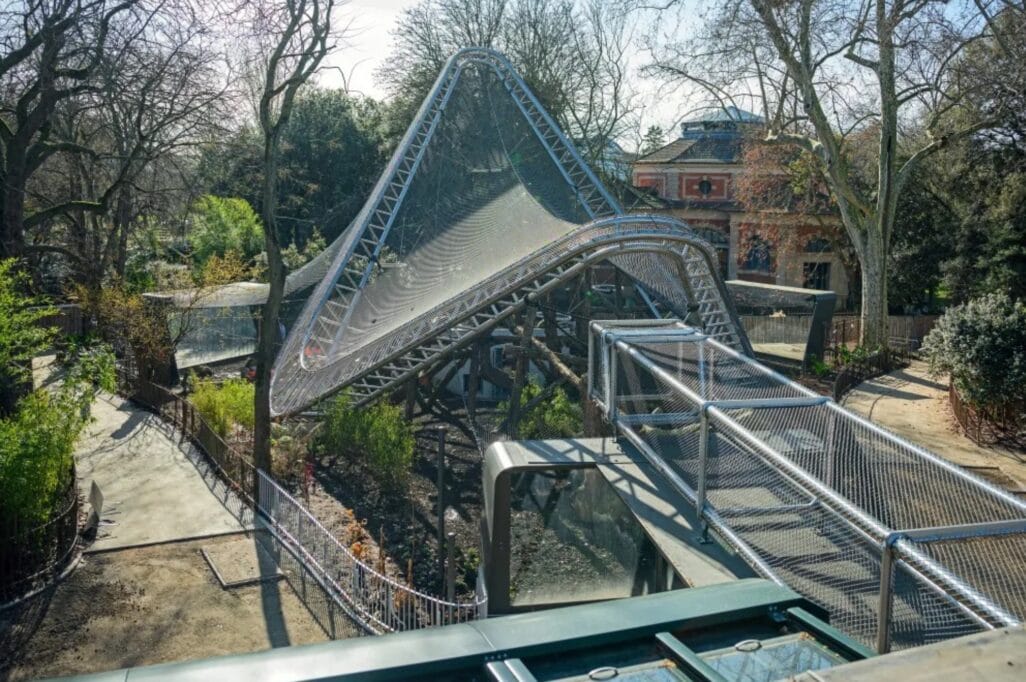 In de buurt van het oude verblijf verrees een strak gebogen, zilverkleurige constructie. Het valt volledig uit de toon met de omliggende, klassieke gebouwen. “De driedimensionale structuur van roestvrij staal stimuleert het klimmen in bomen en heeft een hoogste punt op 15 meter, met uitzicht over de hele Jardin des Plantes”, aldus de dierentuin.