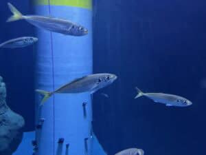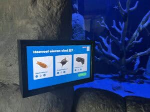 Die steenbolken zijn voorlopig alleen nog op projecties te zien, maar binnenkort ook in levende lijve. Ze krijgen een plek in het grootste aquarium van de expositie. In het voormalige bassin van Noord-Amerikaanse haaien – waar tot voor kort plastic kelp wapperde – staat nu een schaalmodel van een diervriendelijke windmolen. Om de windmolen heen zwemmen horsmakrelen, pijlstaartroggen en gevlekte gladde haaien. Die laatste kunnen tot 1,5 meter lang worden.